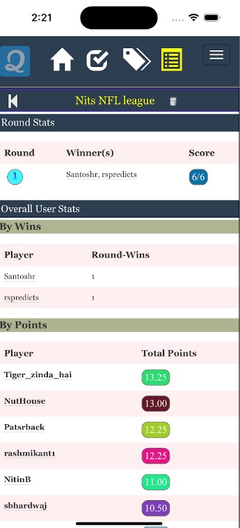 The group members who accurately predicts the most correct winners/margin/player each week gets a win. If two players share the winning score for a week, the win is awarded to both players. We auto calculate points & update scoring dashboard after everygame .